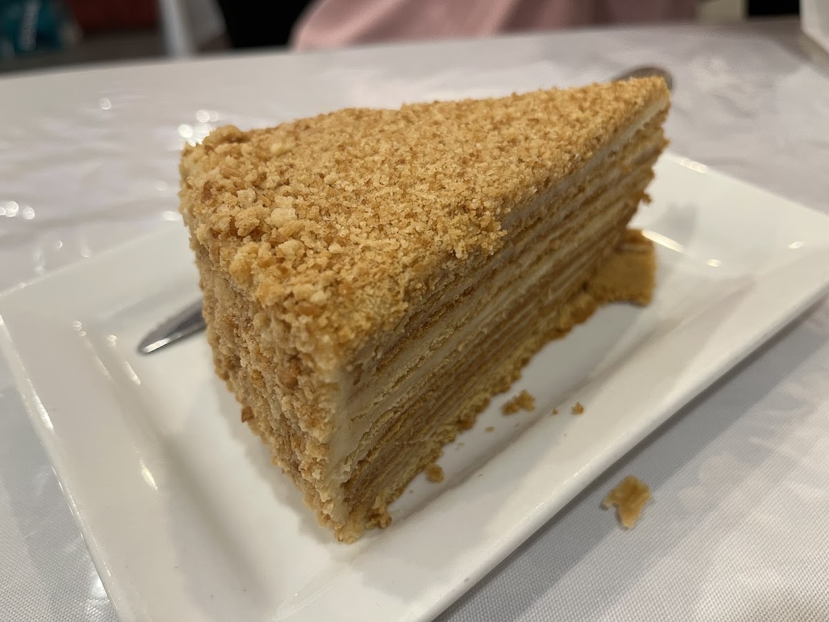 This restaurant doesn't look much from the outside, but it was ultimate comfort food. We loved it so much. Every dish was so good, tastes like homemade. Both soups we tried, borsch and solyanka, were very delicios and satisfying. Both main dishes were very tasty too. Also, we got pot of black tea and both cakes on the menu, which is honey cake and napoleon. I must say napoleon was the best i have had in a long long time. It's not hard puff pastry with pastry cream, like you can find very often, this was very soft puff pastry that absorbed the moisture of the custard. Exactly how I remember it from my childhood. Highly recommend and will most definitely come back next time and every time we are in Chicago.