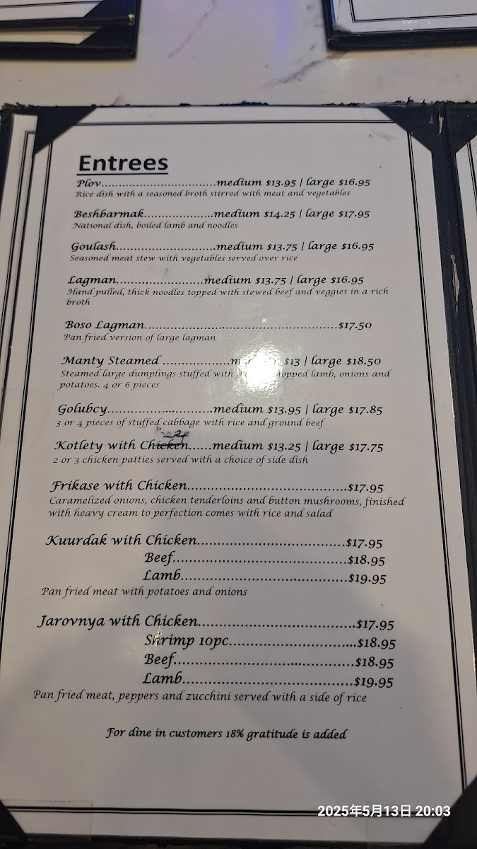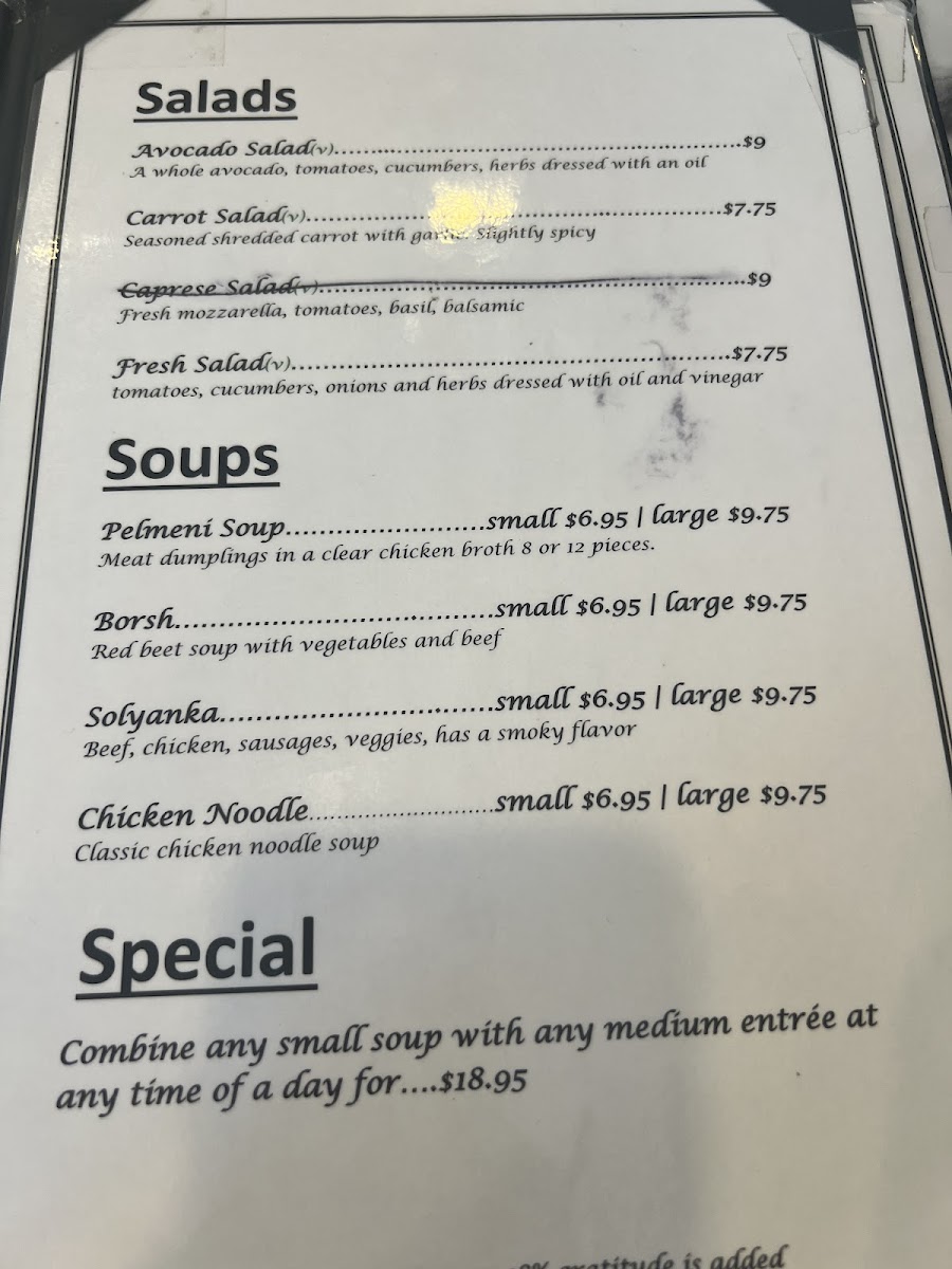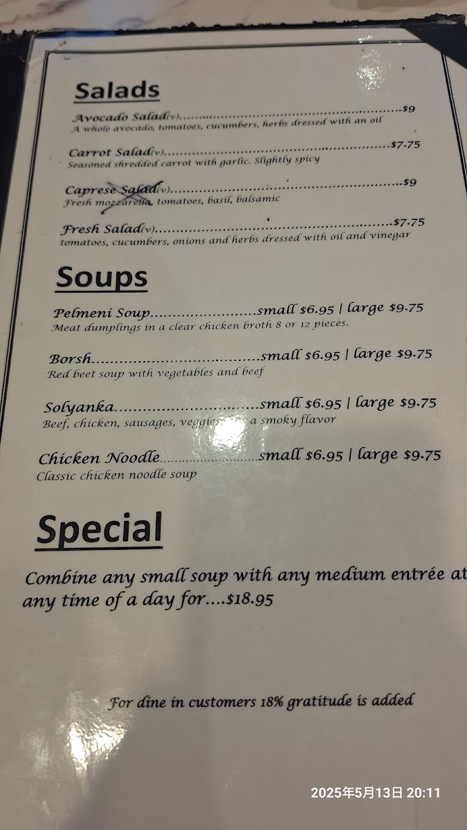 Welcome to EUROASIA RESTAURANT, a hidden gem nestled in Chicago that brings the rich flavors of Eastern Europe and Central Asia to your plate. From delectable soups like borscht and solyanka to comforting dishes that capture the essence of home-cooked meals, every dish is crafted with precision and passion. The cozy atmosphere welcomes you like family, promising a delightful dining experience. Highlights from the menu include hearty chicken noodle soup and savory pelmeni, with all dishes made from fresh, quality ingredients. Enthusiastic service complements the vibrant flavors, ensuring you feel at home even if it's your first visit. Customers rave about the chef's borscht, arguably the best in Chicago, and the inviting staff that enhance the overall experience. Whether you're a local or just passing through, EUROASIA RESTAURANT is a must-visit for anyone seeking comforting, authentic cuisine.